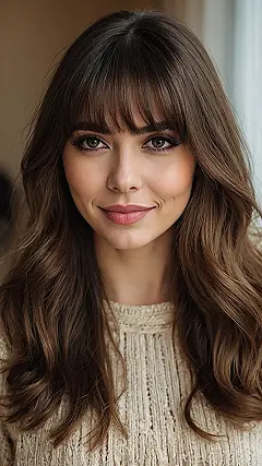 Look at this awesome hairstyle! Our friend here is totally rocking those curtain bangs, which are basically the VIP section of hair for your forehead. They frame her eyes perfectly, making her look like she’s about to spill some really good gossip or just share a brilliant idea for the next group project. With her long, wavy hair and that super cozy-looking sweater, she’s giving off major “I woke up like this and now I’m effortlessly cool” vibes. It’s the kind of look that says, “Yes, I know what a TikTok trend is, and I probably started one.”