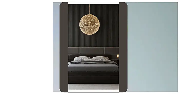 Check out this bedroom wall decor! It’s like they built a fort out of fancy chocolate bars, then added some mood lighting for extra drama. That mirror is strategically placed to check if you have food stuck in your teeth before your big Zoom meeting, or just to admire how awesome you look when you roll out of bed (we’re all awesome, right?).