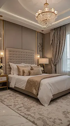 Beyond just a giant bed, this room set practically screams “VIP chill zone.” Notice that super cool bench at the foot of the bed? It’s not just there to look pretty; it’s your designated spot for dumping school bags, trying on outfits, or maybe even staging a dramatic pillow fight entrance. The golden chandelier looks like it’s ready for its own art show, and that abstract painting above the bed? It’s basically saying, “Yes, I’m sophisticated, but I also know how to nap.” This whole setup proves that having a grown-up bedroom can still be incredibly fun and ridiculously comfortable.