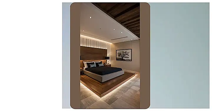 And the rest of the room is just as awesome! Those hidden lights tucked away under the bed and behind the headboard give off serious “VIP lounge” vibes, making everything look extra fancy, even your forgotten socks. With a ceiling that looks like a cool wooden puzzle and that massive tree art watching over you, this bedroom is practically begging for you to just chill out. Who needs to clean when your room looks this effortlessly cool? Just try to avoid spilling juice on the majestic king bed – that would definitely break the royal spell!