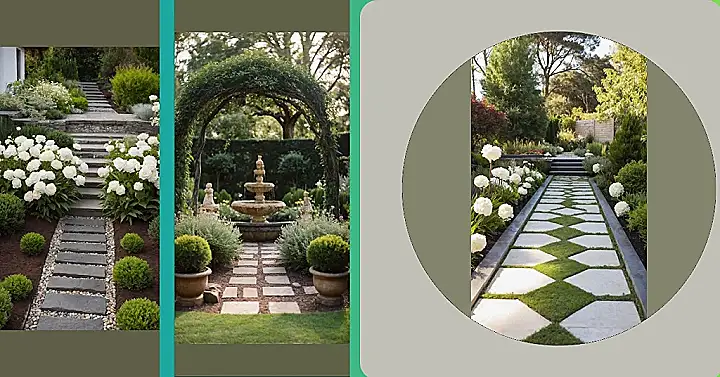 This garden looks like it got dressed up in its fanciest green and white outfit and is totally ready for a photo shoot. Check out that path! It’s not just a boring straight line; it’s got these cool, kinda wonky white stepping stones playing peek-a-boo with perfectly cut green grass diamonds. Honestly, the grass looks like it’s trying its best to form a stylish pattern, probably practicing geometry when no one’s looking. And those big white flowers chilling along the side? They look like giant fluffy clouds decided to land right there, adding a touch of extra fancy to the whole scene.