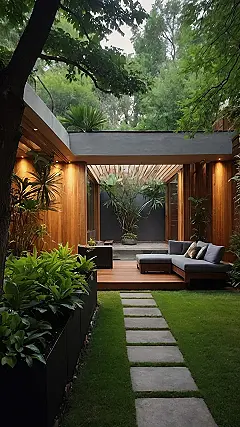 This garden looks like it’s allergic to clutter! The design is so minimal, it’s basically just shouting, “Relax!” You’ve got a comfy couch, some cool-looking plants that don’t require a botanist to maintain, and sleek slabs to walk on. It’s the kind of place where you can actually, you know, *relax* instead of constantly weeding or worrying about trimming a hedge into the shape of a swan.