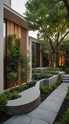 And check out how they tricked the space into feeling bigger and way more exciting! Instead of just a bunch of random potted plants, they’ve got these perfectly arranged greens along the walls, practically hugging that cool tree. The sneaky lighting tucked into the garden beds and shining up the walls makes everything glow like a movie scene, turning a simple patch into a total vibe. It’s proof that even if your outdoor area is more postage stamp than park, a bit of clever design can turn it into your own personal oasis where you can chill, chat, and pretend you’re a nature influencer.