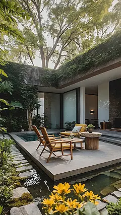 When you think “home garden,” you probably picture a patch of grass you have to mow, maybe some flowers your grandma planted, and definitely no personal swimming pool. But then you see *this*. This isn’t just a garden; it’s practically a secret jungle spa with a built-in chill zone! You could totally pretend you’re on a super fancy resort vacation without ever leaving your backyard. Just imagine kicking back in one of those comfy yellow chairs, listening to the gentle splash of water, and realizing your biggest decision for the day is whether to take a nap or another dip.
