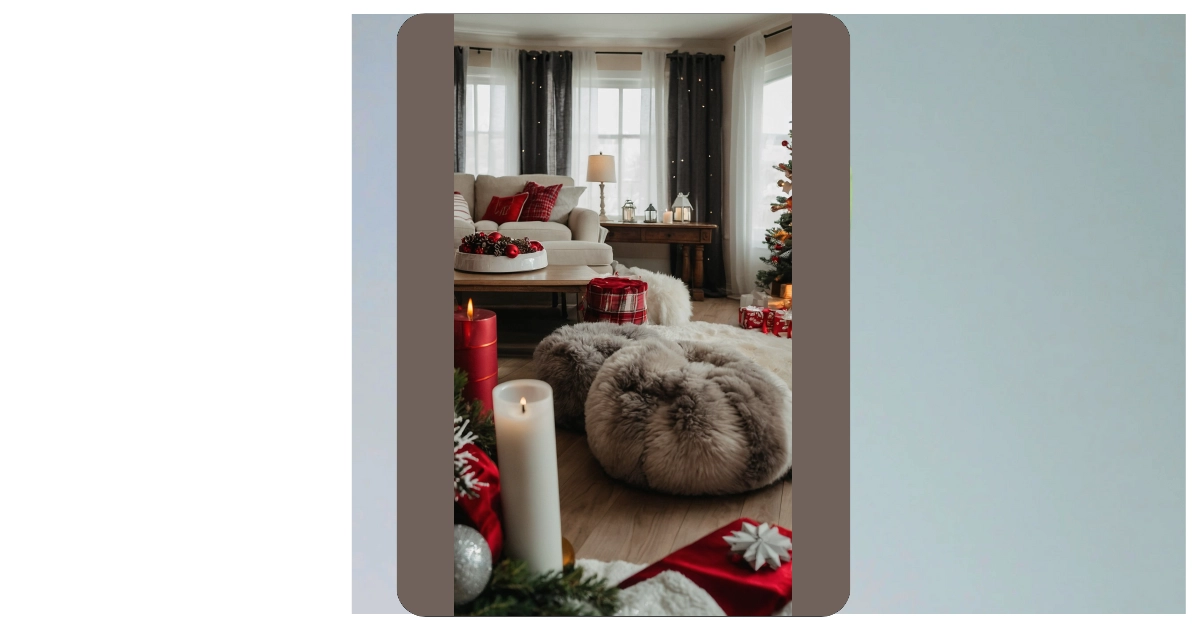 The image shows a living room that’s been transformed into a winter wonderland. It’s got all the warm and inviting feels of a classic Christmas scene. You can just picture yourself sprawled out on one of those fluffy floor pillows, a warm cup of hot chocolate in hand, while the snow falls outside. The red and white color scheme, the twinkling lights, and those fuzzy pillows make it feel like a cozy, festive haven. Plus, there’s even a Christmas tree, all decorated and ready for the holiday spirit.