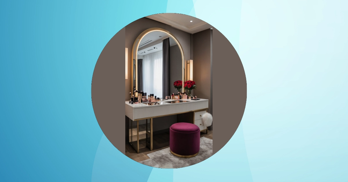 This isn’t just a makeup desk; it’s practically a beauty fortress, ready for all your glamour experiments! Look at that huge arched mirror, perfect for practicing your selfie angles or making sure your eyeliner winged itself correctly. With all those fancy lotions and potions neatly lined up and sparkling, you’d feel like you’re getting ready for a red-carpet event, even if you’re just heading to school. This setup screams “I totally have my life together,” even if your backpack currently resembles a black hole. Plus, that gorgeous vase of roses just adds a touch of “I’m fancy now!” to the whole vibe.
