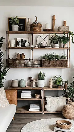 Is your living room looking a bit blah? Time to ditch the clutter and embrace this chill vibe! Check out how simple decorations like plants in woven baskets and a cool wooden shelf can totally transform a space. You could swap out your dusty old bookshelf for this look, and your room would instantly go from “grandma’s attic” to “Instagram-worthy.”