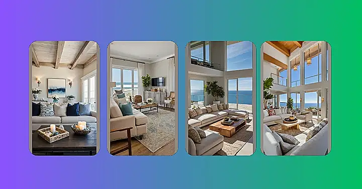 Beyond the epic couch and view, this place just feels effortlessly cool and relaxed. That big, green plant looks like it’s thriving, soaking up all that sunshine, probably jealous of how comfy the couch looks. And the coffee table? It’s solid and cool, perfect for piling up interesting books or just serving as a footrest (carefully, of course!). Everything feels bright and airy, like the ocean breeze is chilling inside with you. It’s got that perfect ‘coastal chic’ vibe – fancy but totally chill, like it just rolled out of bed looking fabulous.