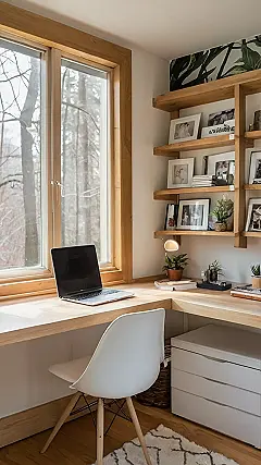 So, you’re thinking of turning that awkward corner in your room into a home office? Awesome! This picture shows how to make it look super classy without turning into a stuffy library. Forget those boring grey cubicles at your parents’ work – this setup is all about wooden shelves, cool plants, and artsy photos to keep you inspired. Plus, having everything organized means less time searching for that one specific charger and more time finishing your history project!