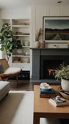This living room is seriously goals! Imagine sinking into that comfy couch after a long day, maybe with a steaming mug of hot chocolate and a good movie. The fireplace is crackling away, providing the perfect cozy vibe, which is way better than just relying on the TV for warmth, right? Plus, that woven coffee table is totally Instagram-worthy; you could spend hours just arranging your books and plants on it. It’s modern and stylish, but also feels incredibly relaxed – like the perfect spot to chill with friends or just have some quiet time.