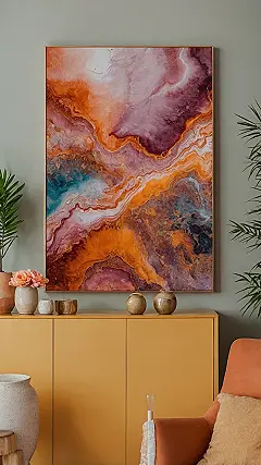 Look at that painting! It’s like a vibrant smoothie spilled across the canvas, but in the absolute best way possible. Those swirling oranges, deep purples, and pops of cool turquoise aren’t just pretty colors; they’re basically a high-five for your brain, getting those happy chemicals (that’s dopamine!) doing a little jig. This art is so energetic, it could probably run a marathon and still ask for extra credit. It’s the kind of visual feast that makes you want to spontaneously break into a dance party, even if your furniture isn’t quite as enthusiastic.
