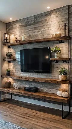 Who knew a farmhouse could look this cool without actual chickens clucking around? This isn’t your grandma’s dusty old barn; it’s a ‘modern farmhouse decor’ masterpiece, blending rustic charm with sleek, chill vibes. Just look at that amazing wood-paneled wall, making your TV feel like it’s hanging out in a super stylish forest, rather than just on a plain ol’ wall. It’s the perfect setup for movie nights, gaming marathons, or just pretending you’re a sophisticated adult who totally knows how to keep those potted plants alive (spoiler: it’s harder than it looks!).