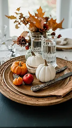 This table setting is like a pumpkin patch exploded all over the place! Seriously, there are so many pumpkins, it’s like someone went to the pumpkin patch and brought the whole darn thing home. They’re all lined up, big and small, like they’re ready for a pumpkin parade. And those little mini pumpkins? They’re like the adorable little cheerleaders for the pumpkin crew! It’s all so cute and cozy, it’s practically begging you to put on your favorite sweater and grab some hot apple cider.