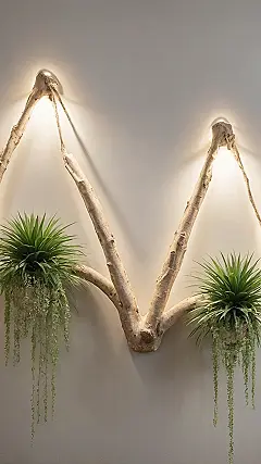 But wait, there’s more! Not content with just being super cool, these wall-climbing branches have decided to host a couple of leafy green VIPs. These aren’t your grandma’s dusty fake plants; these spiky green friends and their dangling vine buddies are practically throwing a party on your wall. It’s like a mini indoor jungle, but without the pesky bugs or having to remember to water anything (unless these are real, then maybe just a tiny bit of effort!). It’s the perfect way to make your space feel fresh, fun, and totally unique – turning a plain wall into the coolest spot in your house.