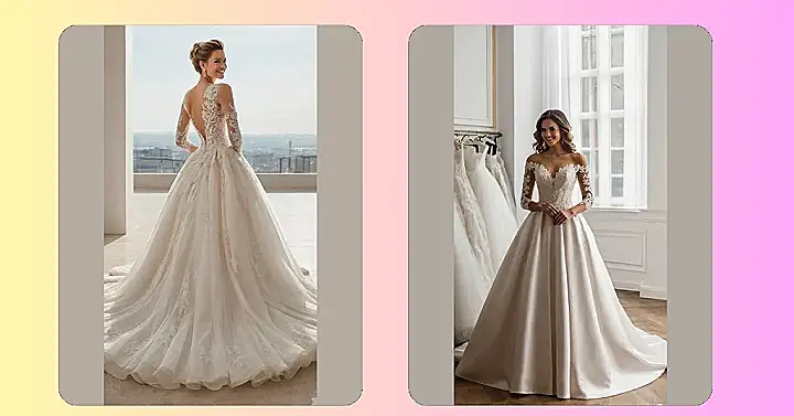 Seriously, look at that satin skirt! It’s so unbelievably swishy and elegant, you’ll probably spend the whole day doing twirls (and maybe tripping over the train a little…just kidding…mostly!). The long sleeves give it a touch of classic sophistication that’s totally stunning. It’s the perfect blend of romantic and modern, and honestly, if I was getting married, I’d totally rock this look. It’s beautiful, comfortable, and definitely picture-perfect!