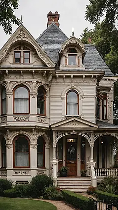 Check out this house! It’s like someone told the builders, “The more decorative bits, the better!” This isn’t your average boxy home; it’s a full-on Victorian masterpiece, packed with so much detail it makes your head spin. Look at all those fancy arches, the little peaks and dormers on the roof, and the unbelievably intricate trim around every single window. You can almost hear the designers from the 1800s saying, “Is that enough fancy stuff? No? Add more swirls and curlicues!” It probably took them longer to decide on the trim than to actually build the walls, and good luck trying to paint all that without needing a dozen different brushes!