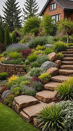 Look at this place! It’s like the rocks here decided to quit being boring pebbles and become superstar models for a garden magazine. They’ve formed a staircase so grand you half expect someone to roll out a red carpet, and built a wall so sturdy it probably holds up the entire hillside’s confidence. Forget flat, boring yards; this is landscaping where the rocks are the main characters, chilling amongst the plants and making everything look totally amazing without even trying (or needing to be mowed).