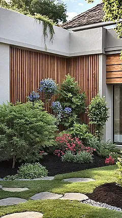 Forget about needing acres of land to have an awesome garden! This picture proves that even a cozy corner can be a total showstopper. Look at that clever stone path winding its way through the greenery – it’s like a secret shortcut to relaxation, without having to actually hike anywhere. And those plants climbing the wall, all fancy with their pink and orange blooms? They’re basically giving your garden a stylish high-five, showing off without taking up precious floor space. Who needs a giant lawn to mow when you can have this perfect little escape right outside your door, looking this good?