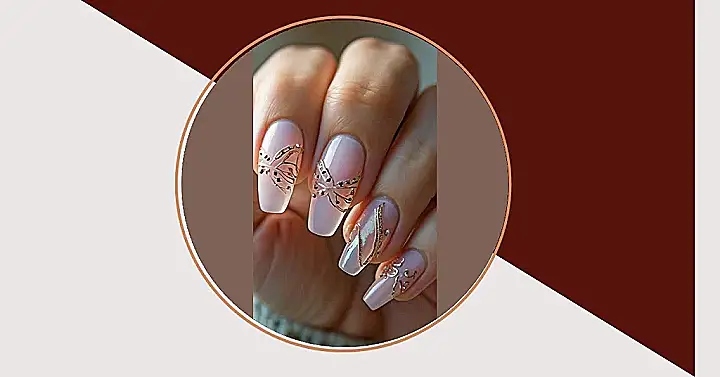 These nails are screaming ‘spring break’ even if you’re just heading to the library! The pale pink polish is like the perfect sunset shade, and the gold designs add a fancy touch without being too extra. It’s like they took inspiration from delicate vines and sparkly butterflies, making them totally ready for the 2025 nail trends.