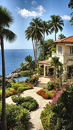 Peering at this absolutely gorgeous tropical house, you can practically hear the imaginary steel drum music and feel a warm, breezy hug. This place is basically a permanent vacation; who needs a getaway when your actual home looks like this? Just picture yourself strolling up those neat stepping stones, leaving all your worries (and maybe that upcoming math test) far behind. The whole place glows with such a warm, inviting light, it’s like it’s winking at you, whispering, “Come on in, your only job here is to chill out.”
