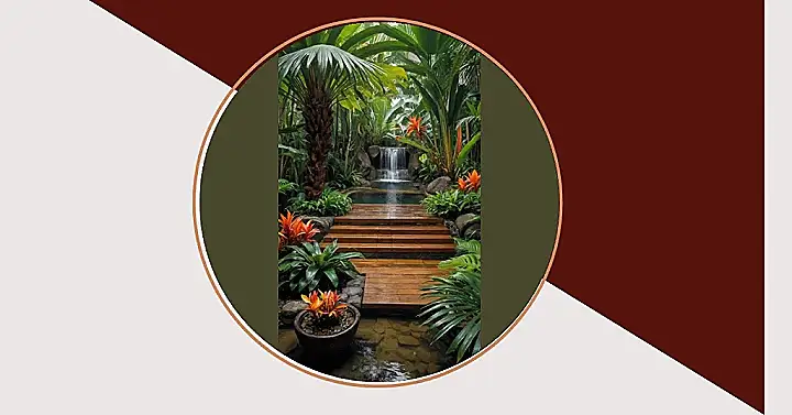 Stepping onto those wooden planks in the picture feels like you’ve just teleported straight into a movie scene, maybe Indiana Jones meets a luxury resort spa. Look at those tropical garden plants! They aren’t messing around with little tiny leaves; these guys are rocking foliage bigger than your head, practically screaming, “Welcome to the jungle party!” They’ve got all the drama with their huge fan palms and spiky bright orange flowers that look like they just arrived in a limo. It’s like the plant world decided to turn the volume up to eleven, showcasing that lush, vibrant green that makes you feel like you need a smoothie and a break from reality.