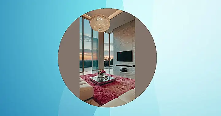 This room is so fancy, it’s like stepping into a cloud! Imagine sinking your toes into that fluffy pink rug, feeling like you’re walking on a marshmallow. The giant windows show off a beautiful sunset, making you feel like you’re in a magazine. Those big, round light fixtures look like they’re about to float away, and the whole place has a chill vibe that makes you want to relax and enjoy the view.