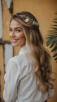 Who knew a few bouncy curls could bring so much festive cheer to your Christmas look? This hairstyle is all about looking effortlessly glam, and while those orange flowers might not be the usual red and green, they add a super cool, unique pop! So, as you gear up for hot cocoa sessions, endless holiday movie marathons, and maybe even some caroling (if you’re brave), remember your hair can be just as much a part of the celebration. Don’t be surprised if your gorgeous, wavy locks accidentally get tangled in some twinkle lights – it just adds to the holiday magic (and maybe a funny story for later!).