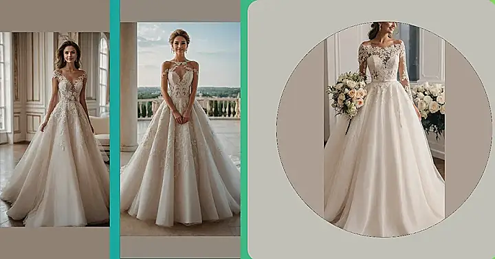 Whoa, check out this romantic wedding dress! It’s got all the fancy lace and sparkle you’d expect to see in a classic rom-com movie. This dress probably weighs more than my backpack, but it looks totally worth it for that epic entrance moment. Just try not to spill anything on it before you make it down the aisle, because laundry day for this beauty would be a nightmare.