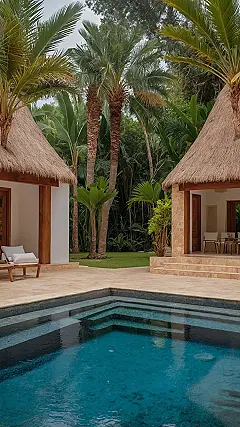 Forget your textbooks and that super dramatic group chat for a sec, because this ‘relaxing villa’ is basically a tropical chill-out cheat code! Just look at those awesome thatched roofs and the endless palm trees swaying like they’re doing a slow, happy dance. It’s like someone decided to take all the best parts of a vacation poster and plop them right here, ready for you to dive into that sparkling blue pool. You could practically hear the ‘ahhh’ sound effect just looking at it, right? It’s the kind of place where your biggest problem would be deciding which shade of green palm tree looks best.