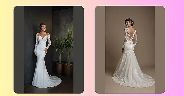 Talk about a dress that makes you want to spin around and maybe even break into a happy little dance! This stunning gown, with its elegant off-the-shoulder neckline and those absolutely dreamy lace sleeves, makes anyone look like they just stepped out of a fairytale. It’s the kind of dress where you glide, you sparkle, and you probably won’t even notice if you accidentally step on a few toes while showing off that beautiful train. And if it were crafted from sustainable organic cotton, you wouldn’t just be a vision, you’d be a planet-saving fashion icon!