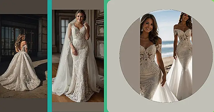 The intricate lace and that off-the-shoulder design are pure dreamy perfection. It’s giving us serious mermaid vibes, but instead of scales, it’s delicate floral designs. And that train? It’s like they’re floating on clouds! If this is what a wedding dress aesthetic looks like, sign me up! It’s so elegant, yet it’s also super fun and totally beach-appropriate. It’s the kind of dress that would make even the grumpiest person smile.