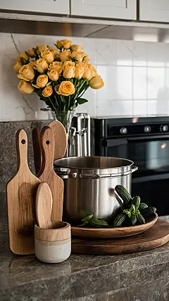 Who knew a bunch of bright yellow roses could instantly upgrade your kitchen from “just a place to grab snacks” to “fancy adulting vibes”? These cheerful blooms are like a secret weapon for simple kitchen decor, shouting, “Hey, maybe today we’ll actually make something more exciting than toast!” Paired with those stylish wooden cutting boards and utensils, which honestly look too good to actually chop onions on, you’ve got a setup that screams “I have my life together,” even if your biggest culinary achievement is mastering instant ramen.