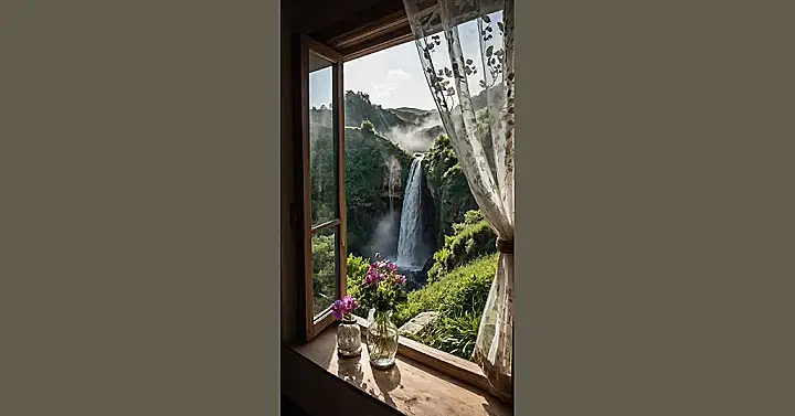 Peeking out of this window, you’d probably do a double-take – is that a real-life, roaring waterfall in your backyard, or did you accidentally teleport to a nature documentary? With lush green mountains practically misting your face (or at least, making you wish they were!), and gorgeous flowers chilling on the windowsill, this view is totally flexing on every other boring brick wall or fence-line window out there. You might even find yourself reaching for a raincoat, just in case a rogue splash decides to say hello!