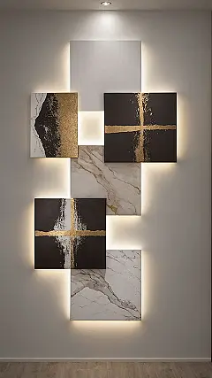 Forget those tired, peeling posters from last year; this bedroom wall decor is like giving your room a serious promotion! Those lit-up panels and cool abstract designs, some looking like fancy marble and others rocking gold splatters on black, turn your plain wall into a personal art installation. It’s so cool, you might just feel like you’re sleeping in a super chic, secret art gallery, instead of just, you know, your bedroom. Your wall will be silently judging all other boring walls with its newfound, sophisticated glow.