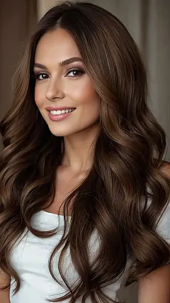 It also looks super healthy and shiny, which is basically hair goals, right? You know, the kind of hair that looks amazing even if you just rolled out of bed (although let’s be real, it probably took a styling iron and half a can of hairspray to achieve that “effortless” look, lol). Still, she’s rocking that cool chocolate brown like a boss.