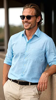 Let’s be real, some days you just want to roll out of bed and magically look like you spent hours planning your wardrobe. Well, this guy clearly found the secret scroll! His light blue button-up shirt and fresh white pants scream “I’m stylish, but I also enjoy sleeping in.” It’s like the official uniform for looking sharp without trying too hard, perfect for those days when you want to impress without anyone suspecting you just threw it on. Plus, that confident smile? That’s what happens when your shirt outfit is doing all the heavy lifting!