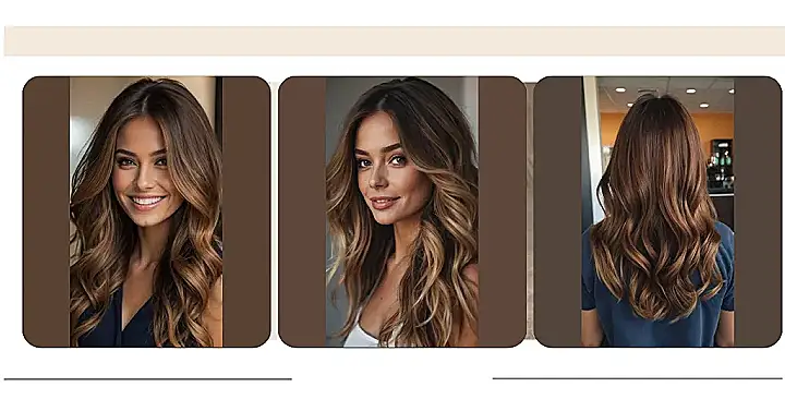The picture shows a hairstyle that’s all about effortless, natural-looking beauty. Think of it like a warm autumn day ‚Äì the sun gently kisses your hair, leaving behind a soft, golden glow. With balayage, the color blends beautifully, like the leaves changing colors in the fall. No harsh lines, just a smooth transition from darker roots to lighter ends that gives the whole look a super chic vibe. It’s like your hair is saying, “Yeah, I’m gorgeous, but I didn’t spend hours getting ready. I’m just naturally this fabulous.”