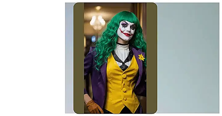 This lady is rocking the Joker’s look! She’s got the classic green hair, the mischievous grin, and a killer outfit that’s got that purple and yellow combo going on. You know, like the classic Joker look, but with a twist! It’s like she said, “I’m the Joker, but make it fashion!” Who needs a fancy suit when you’ve got that iconic Joker style?