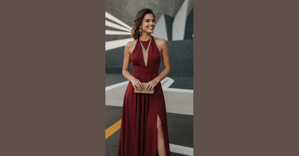 That dress is so fancy, it looks like it came straight out of a fairytale! The deep red color is perfect for making a statement, and the sleek, simple design means you’ll be the most stylish person at the dance. Plus, that daring slit adds a touch of extra confidence, making you feel like you can do anything! Don’t forget the dazzling jewelry – it’s the cherry on top of your already amazing look.
