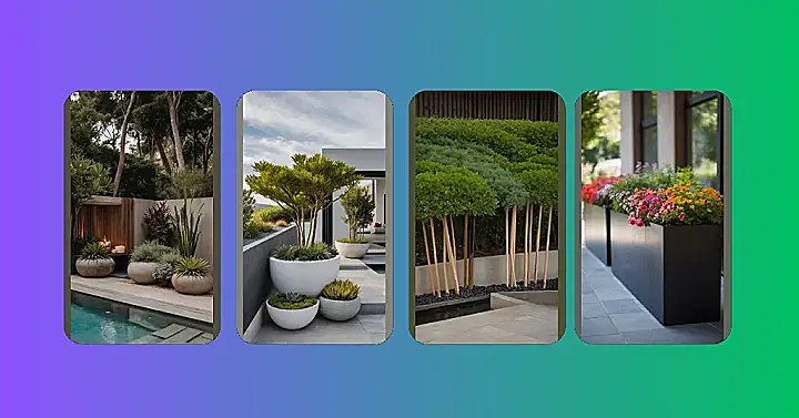 Check out these plants! They look like they’ve just stepped out of a fancy salon, especially the ones with those super smooth, light-colored trunks. It’s like they decided, “Why grow a thick, boring trunk when you can rock a chic, slender look?” Tucked into these cool deck planters, they’re basically the fashion models of the plant world, strutting their stuff next to a shimmering water runway. They’ve even got their own black pebble carpet, which is way fancier than regular dirt. These aren’t your grandma’s flower pots; these are where plants come to feel fabulous and add serious style to any outdoor hang-out spot.