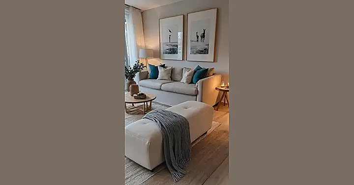 Stepping into this room is like getting a giant, soft hug from a cloud – a cloud that’s also super stylish and probably smells like a fancy candle. Those big, cushy couches and the giant ottoman draped with a cozy blanket practically scream, “Forget your homework, come lounge here forever!” With all those calm, creamy colors and little splashes of cool teal, it’s the ultimate antidote to a chaotic school day. You could totally picture yourself melting into that sofa, scrolling through TikTok, or just staring at the wall until your brain reboots.