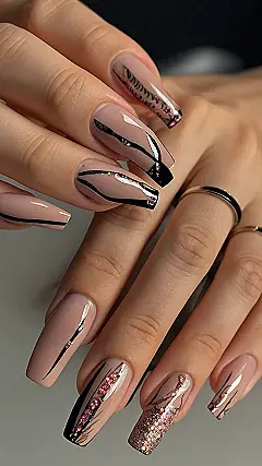 These nails are seriously giving off major sophisticated vibes! The combo of solid black polish and the nude color with gold designs is like a fancy party in your hands. Imagine rocking these to a school dance or a chill hangout with your friends – you’d definitely be the nail art queen!