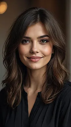 This awesome hairstyle totally nails the ‘effortlessly chic’ look! See how the bangs gently frame her face, parting in the middle like a stylish curtain? That’s the magic of curtain bangs right there. They give off such a friendly, relaxed vibe, making her smile even more inviting. It’s like they’re saying, “Yeah, I woke up like this, and my hair just naturally falls perfectly.” No more battling with a full fringe that has a mind of its own or dealing with hair poking your eyes during a pop quiz. These bangs are the perfect way to add some flair without all the fuss.