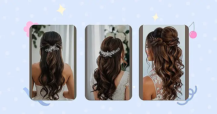 Finding the perfect hairstyle for your wedding day can be as thrilling as finding the dress itself, especially when you consider the versatile charm of a half up, half down look. This style beautifully frames the face while allowing your locks to cascade gracefully down your back, creating an ethereal aura on your special day. Whether adorned with delicate flowers, elegant hairpins, or sparkling jewels, these hairstyles can reflect your personality and wedding theme, from rustic elegance to modern chic. You can play with the texture too — think soft curls for a romantic vibe or sleek and straight for a more polished appearance.