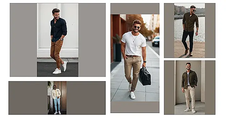 This guy is rocking the casual look. A simple white tee, some khaki pants, and a snazzy leather bag make him look like he’s ready to conquer the world, even if it’s just a trip to the coffee shop. He’s got that relaxed vibe that’s perfect for everyday wear. Plus, those white sneakers just scream “I’m cool and comfortable, and I know it!” He’s definitely got that “effortless chic” thing going on.