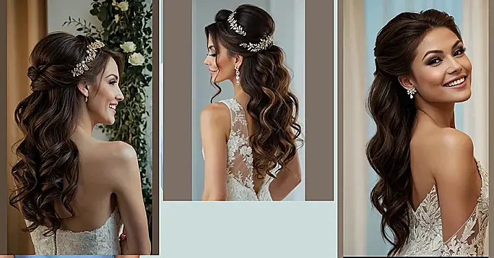 This hairstyle is like a fairytale come to life! It looks like a beautiful crown of tiny leaves and pearls, which is perfect for a princess, or, you know, any girl who wants to feel like one on her big day. It’s not too over-the-top, but it’s still really fancy and makes your hair look amazing. It’s kinda like the cherry on top of your wedding day look!