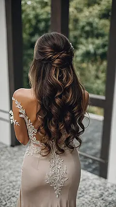 The bottom part of the hair in this photo is doing some seriously impressive wavy things. It’s not just straight or boring; it’s got these bouncy, perfect curls that probably took a team of tiny hair fairies hours to craft. This whole half-up, half-down vibe is super smart because you get the fancy braided bit and sparkle on top, but you also get to let your hair feel free and flowy down your back. It’s like having the best of both worlds – formal up top, party down below, and looking amazing the whole time!