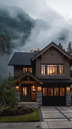 This house is like something out of a fairytale! It’s nestled right up against a mountain, which is so cool. Imagine waking up to the fog rolling in every morning! It’s almost like the house is floating on a cloud. The windows are all glowing, and it looks like someone’s making a delicious dinner inside. This house is the perfect place to escape from the hustle and bustle of everyday life. It looks so peaceful and relaxing, I’d love to curl up with a good book by the fire.