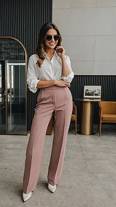 Check out this vibe! This whole look is basically saying, “Yes, I’m here to handle business, but also, look how fabulous my pants are!” Those wide pink pants are like the super-comfy but secretly powerful version of grown-up clothes, paired with a classic white shirt that means you’re not messing around. Adding sunglasses indoors? That’s just extra boss points, showing you’re ready for anything, maybe even dealing with super bright office lights or just wanting to look mysterious while you find the coffee maker.