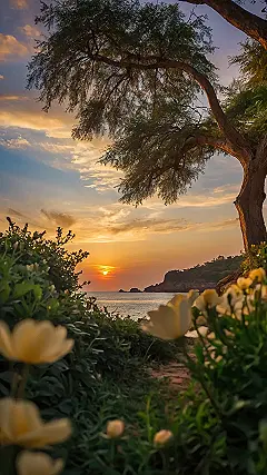 This picture is like a postcard from a dream! It’s got everything you need for a calm and relaxing getaway – a gorgeous sunset, a peaceful ocean, and a big, friendly tree that seems to be saying “Come on in, the water’s fine!” Imagine yourself strolling along the beach, the warm sand between your toes, and a gentle breeze whispering through the leaves.